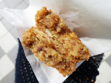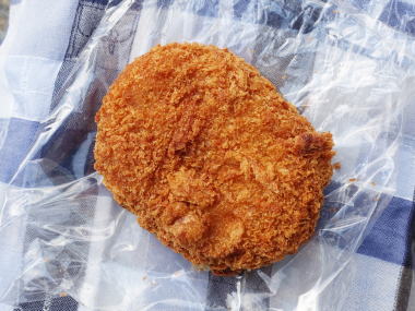 4種類あるコロッケから「地鶏コロッケ」90円(税込)を選んだ。初めて食べたが 許可を得て撮影