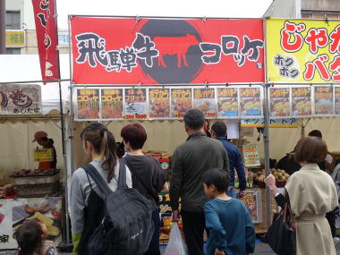 野菜、米販売もあって賑やか。屋台ゾーンで「飛騨牛コロッケ」を販売
