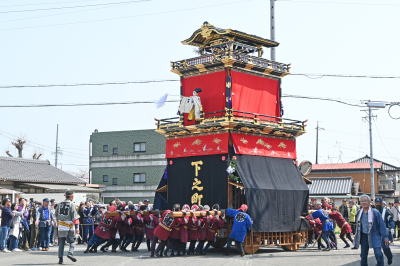 上市場車 新溝神社前 右が山車蔵 前輪を持ち上げて回転します