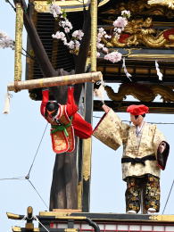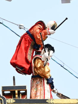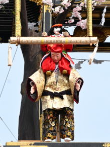 唐子が肩に乗り登場 唐子が台に移る 逆さになり鐘を突く