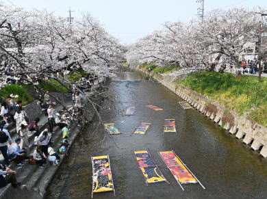 五條川 中島屋旗店の「のんぼり洗い」 桜は満開!夜桜のライトアップあり