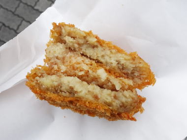 コロッケは大き目、肉少な目、マッシュポテトか柔らか目で玉葱のせいか甘め 90円 ’21.09