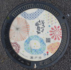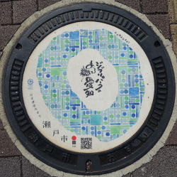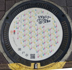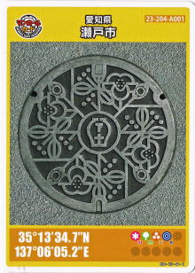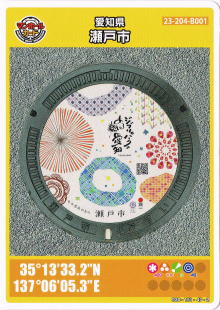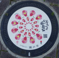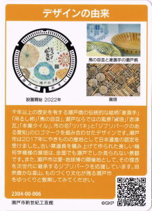 瀬戸市新世紀工芸館 伝統的な絵柄と市の花「ツバキ」と「ジブリパークのある愛知」のロゴ