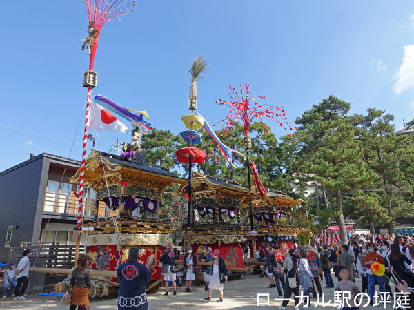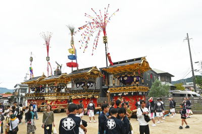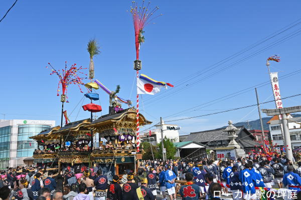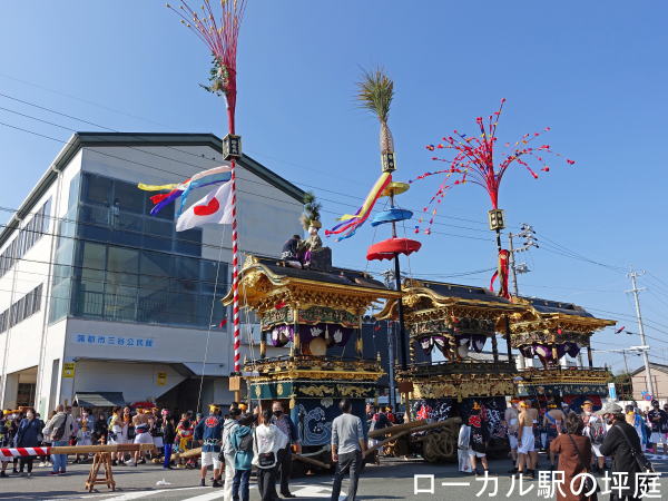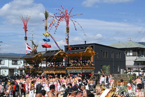 八剱神社前到着 この後、八剱神社にて「練り始め」「引き分け」で山車は