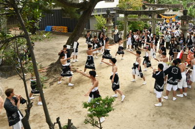 八剱神社前 この後、八剱神社にて「練り始め」ここで「引き分け」で