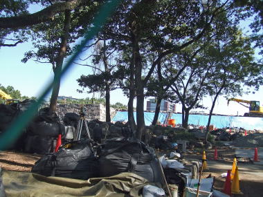 石垣積みは一休み、背後に土砂を注入 ’24.05.23 ノミの音が響き渡る ’24.05.24