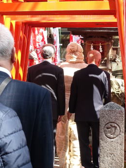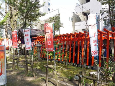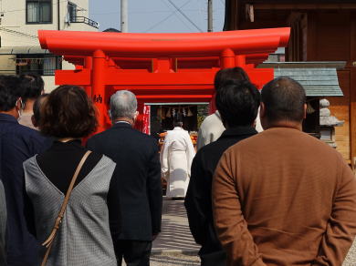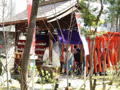 稲荷社前は初午で高齢者が多く本殿・授与所前は若い女性ばかりでした