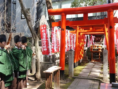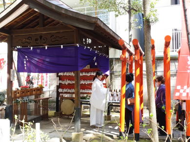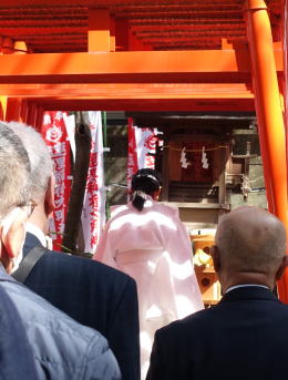 最初に氏子と狐が参加して神事を行う お祓いを受ける 雅楽演奏が続く