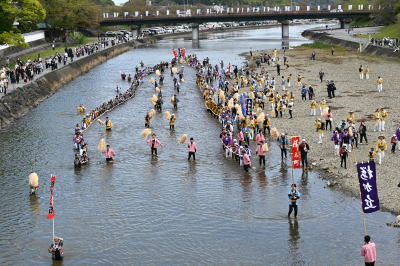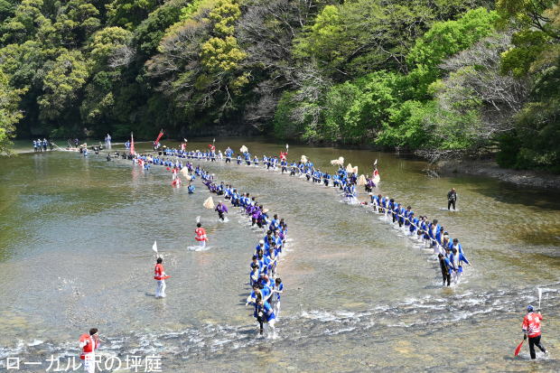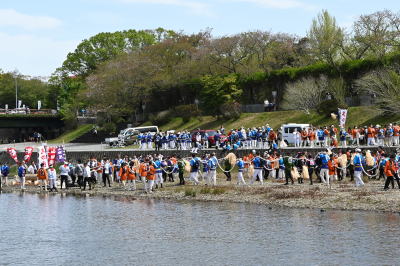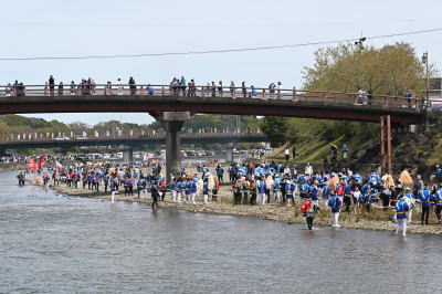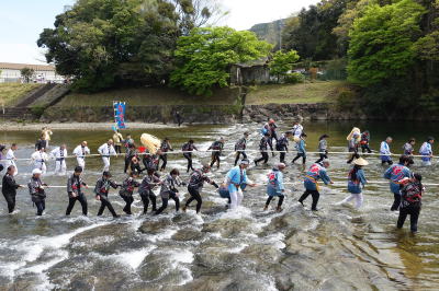 烏帽子岩付近の堰を越える 堰越で応援者多数