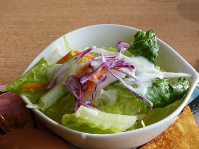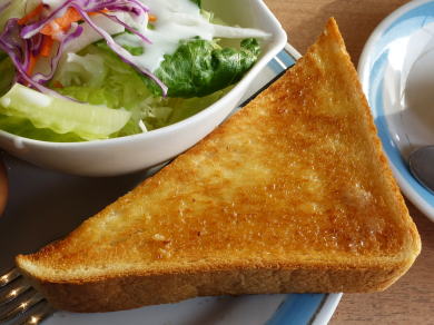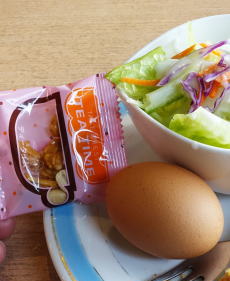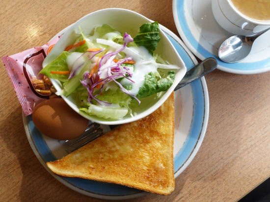 ワンオペ。コーヒー+サラダ、バタートースト(小倉が乗るが断った)、ゆで卵