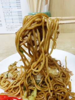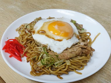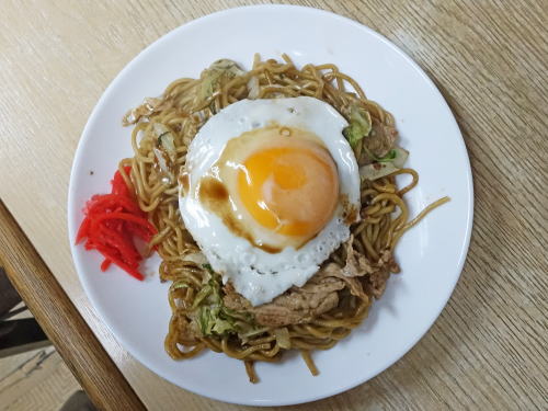 早速、女将さんが焼き始めた。渡された焼きそばは懐かしい味 700円 ’25.11
