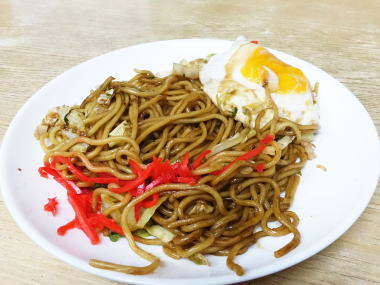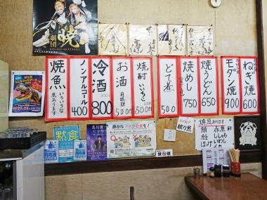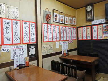 時が止まったようなお好み焼き店。酒類とアテは少ない。焼きそば肉・玉を選んだ。