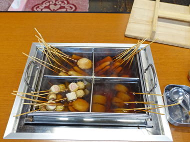 左のテーブルは一枚板? 右はおでん鍋入りテーブル おでんも関西タイプ?