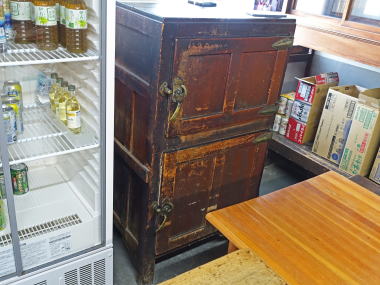 こちらが昼飲みスペース。右でスルメ、ビーフジャーキー(100円)等を販売 缶ビール等は水冷式で冷やしている