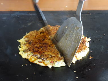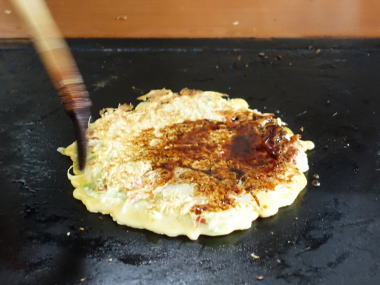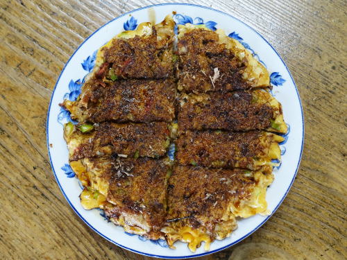 お好み焼きはもっちり、ソースはやや辛目で酸味がある。酒に