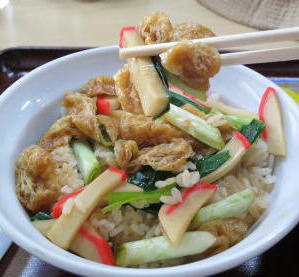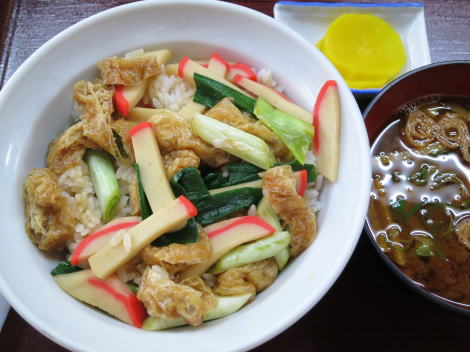「志の田丼」御覧の様に、油揚げ、かまぼこ、ネギを醤油仕立で煮て丼に