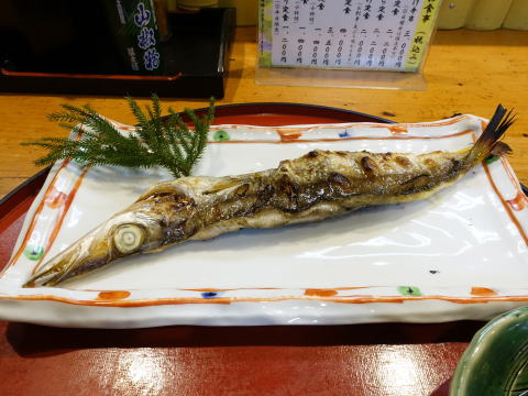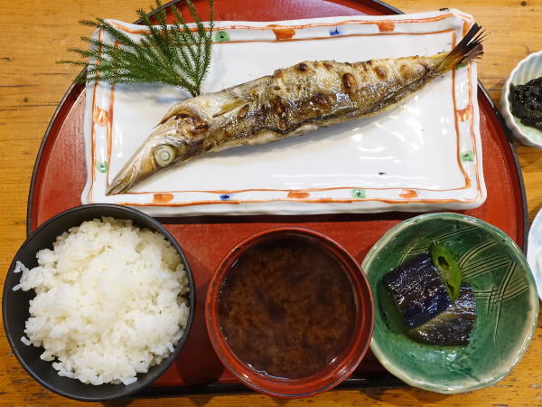 日替わり定食はカマス(半身)の焼き物だったのでこれを選んだ。焼魚は家や