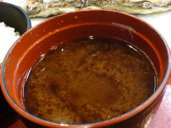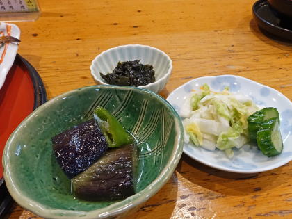赤出汁、漬物が付く。白身の焼き魚と茄子の煮物はジジには良い、1200円 ’25.10