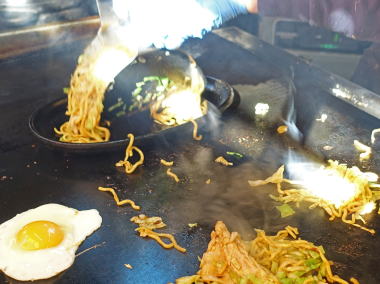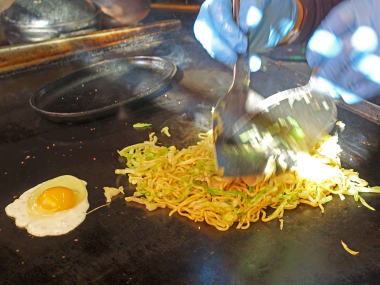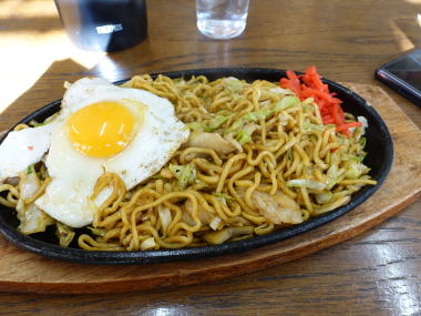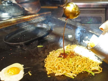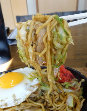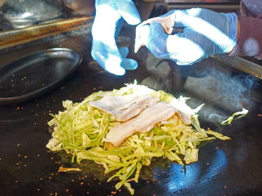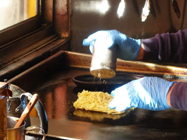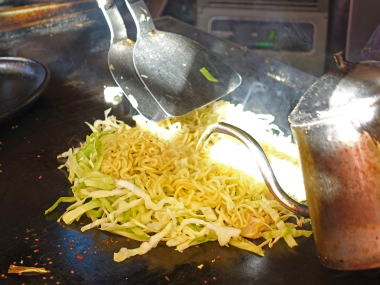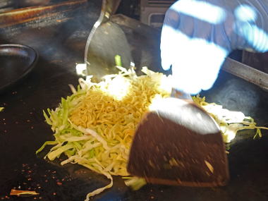 選んだ。早速、大将が焼始めたが麺、肉は多めでキャベツは特に多い。ソースは