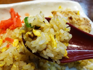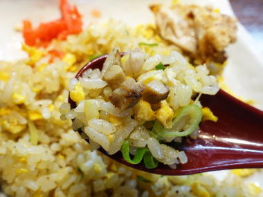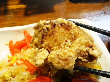 炒飯はパラパラでスパイスがしっかり効いている。スープも同様、鶏の唐揚げは