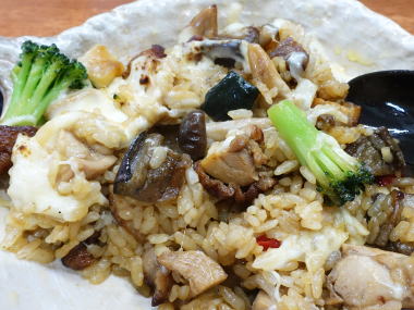 茄子、.ぶなしめじ等が入った炊き込みご飯+ブロッコリーがベースで上に乗った