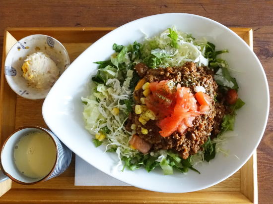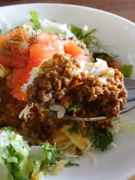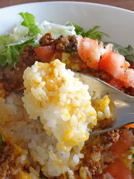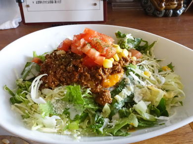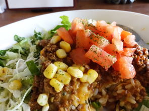 沖縄ソバか迷ったが「タコライス」を選んだ。あまり混ぜずに、野菜類は箸で