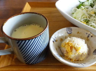 玉子が混じったポテトサラダとコーンスープが付く 850円 ’26.02