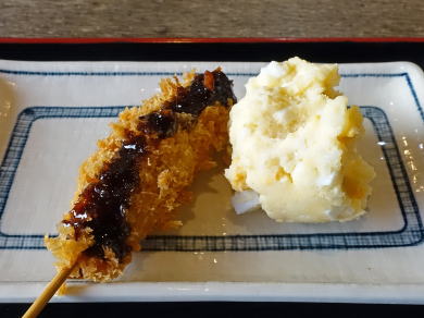 ツルツル。出汁は昔懐かしい味。串カツは.肉たっぷり、ポテトサラダも