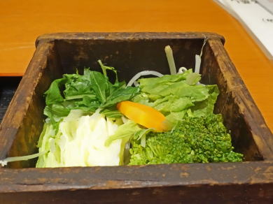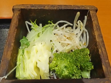 野菜せいろ蒸し 水菜の葉、?、ブロッコリー、キャベツ、人参 下に水菜の茎、モヤシ