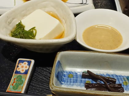 やっこ豆腐、野菜せいろ蒸し用の胡麻ダレとふきの佃煮 多めの味噌汁