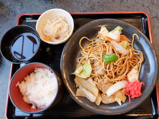 ソース焼きそば定食を選んだが席に着くとすぐ届きます。広い店内ですが