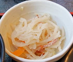 切干大根が人参、ベーコンと共に白醤油で炊いてある