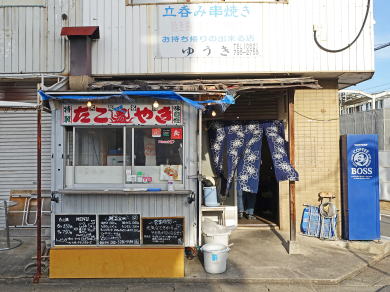 名鉄喜多山駅北すぐにある居酒屋&たこ焼き屋さん。店内で昼飲みしている 立ち飲み店ですが椅子あり