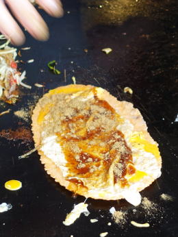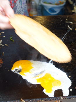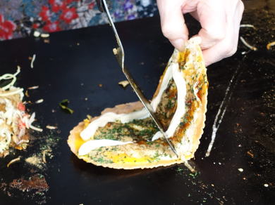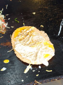 他で焼かれている中に、鉄板焼きそばの上にお好み焼きが載ったのがあった。